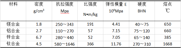 對于消費類產(chǎn)品而言,常用的合金材料有鋁合金、鋅合金和鎂合金。鈦合金由于其生物相融性好,常用在醫(yī)療領(lǐng)域。歸納性的總結(jié)先放在前面,見以下性能表。
